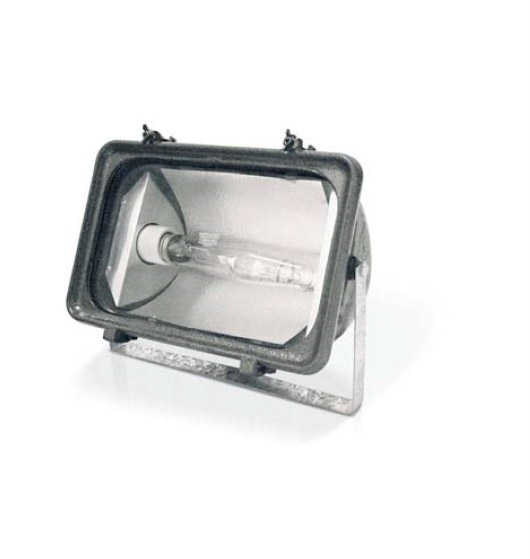 Projetor para iluminação especifica fechado para uso interno e externo, para 1 lâmpada. Corpo em alumínio fundido, com aletas de dissipação de calor. Refletor simétrico em chapa de alumínio stucco. Difusor em vidro plano temperado transparente.
